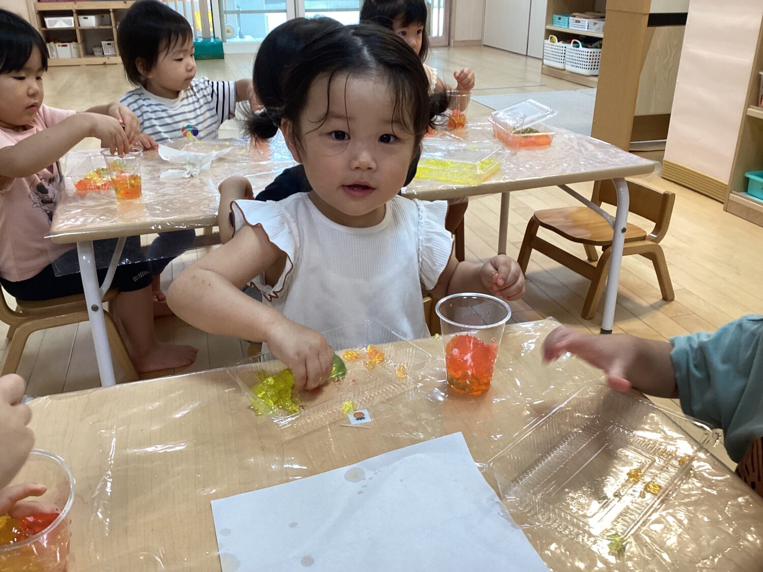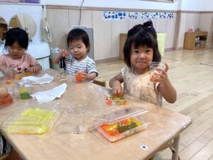 2歳児クラスでは色とりどりの寒天であそびました! はじめは、なかなか触りたがらなかった子ども達でしたが、だんだんと感触を楽しむ姿が見られました。 透明コップに入れてみたり、いろんな色を混ぜてみたり。 電気に透かして見ると「キラキラしてる!」と大発見してる子もいましたよ。